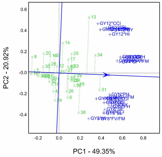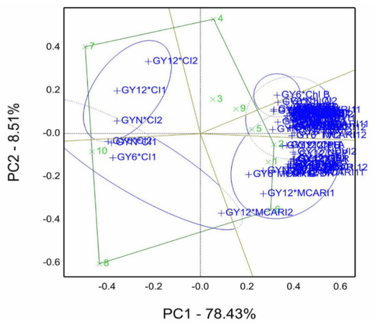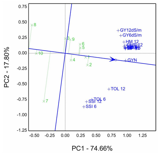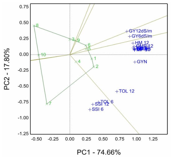 The genotype by trait (GT) and genotype by yield*trait (GYT) was proposed by [45,46]. It is considered a graphical selection tool in breeders’ hands for screening and ranking genotypes, which subjected not only grain yield across environments but also the associated traits such as agronomic traits, physiological traits, and end-use characteristics, for example, biotic stress of rusts disease characteristics [47,48] and abiotic stress such as barley drought tolerance [49], and rice [50], and durum wheat [51]. Moreover, Sardouie–Nasab et al. [13] performed salinity tolerance indices using principal component analysis (PCA) to identify salinity tolerance of wheat genotypes. The genotype by trait (GT) and GYT biplot techniques are practical tools, which make genotype selection beneficial and appropriate, specifically in cases evaluated under stress conditions [49]. The recent GYT model calculates by multiplication of genotype grain yield mean by other traits, such as grain yield (GY) by plant height (PH), (GY*PH) in case the desired value is the highest value. However, grain yield is used when the lowest value of the combination is desired, such as for grain yield and lodging (GY/LO) [46].