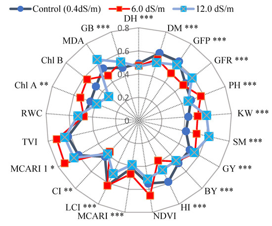 Radar chart for mean performance and significance of genotypes (p < 0.001) of plant height, spikes per pot, spike length, biomass, grain yield, harvest index, chlorophyll fluorescence, and chlorophyll content index of forty genotypes grown under 0.4, 4.0, 8.0, and 12.0 dS/m diluted seawater in the 2019/20 season. *** significant level at 0.001.