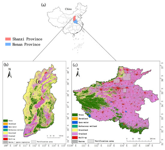 Map of China (a) Land type coverage map of (b) Shanxi Province and (c) Henan Province in 2020.