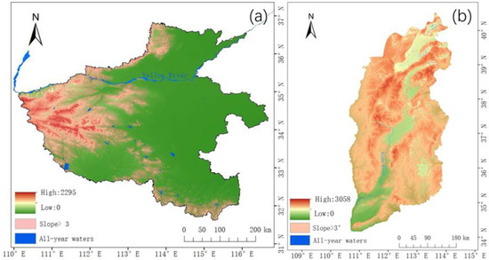 Maps of the high slope (slope > 3°) regions and all-year water regions in (a) Henan and (b) Shanxi provinces.