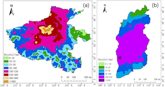 Spatial distribution of rainfall of (a) Henan Province from 16–21 July 2021 and (b) Shanxi Province from 2–7 October 2021, respectively.