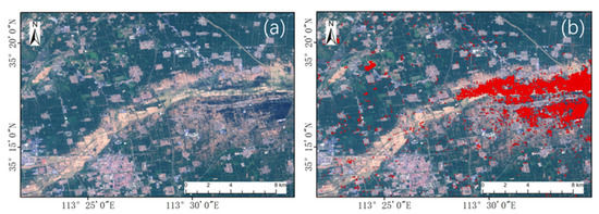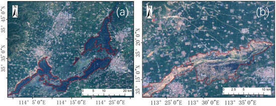 Continuous heavy rains prevents rainwater from infiltrating in time to prevent surface runoff, forming rainwater collection in the areas of low terrain and topographical enclosures. This water cannot drain away and spread in a short time. Agricultural floods cause inundation of agricultural land and destruction of crops, resulting in reduction or even total loss of crops. Compared to the time before the flood, the flood leads to an expansion of the water bodies and inundation of the surface, i.e., the flood-inundated area (Figure 4a). Moreover, the area in which the additional soil moisture forms silt but no water collects on the surface is called the flood-affected area (Figure 4b).