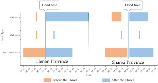 In addition, in order to achieve enough spatial coverage, a specific period before and after the flood was selected as the time window. After that, the image maps of the entire study area before and after the flood were synthesized. When stitching the images, to further control the errors, a 0.9 quantile of all available data at each pixel was selected as the final result. In this study, a total of 21 images from 1 to 19 July 2021 were selected for the pre-flood data and a total of 29 images from 20 July to 15 August 2021 were selected as after-flood data (Figure 5). The detailed influence of time window size will be discussed in Section 4.2.