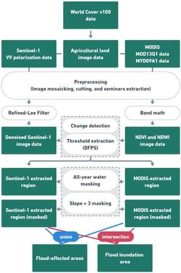 Figure 6 shows the technical workflow of this study. First, the Sentinel-1 and MODIS image data was acquired for preprocessing, including mosaicking and cutting. The preprocessed results were subsequently masked by all-year water and high slope (slope higher than 3°) regions. After that, the refined-Lee filter was applied on Sentinel-1 data for denoising, and band math was applied to MODIS data for generating NDVI and NDWI images. Then, change detection was performed on the multi-source images acquired before and after the flood to obtain the difference image. The optimal thresholds for each index were calculated using the Double-window Flexible Pace Search (DFPS) threshold determination method, and the flood extraction results of the radar data. We did not use the classic histogram-based extraction method mainly because of the area of flood regions are relatively small compared with the whole study area. The bimodal histogram is blurry and flood information is indistinguishable (Figure S2). Finally, the intersection image of the Sentinel-1 extraction results and the MODIS extraction results was the flood inundation area, and the combined image of them was the flood-affected area.