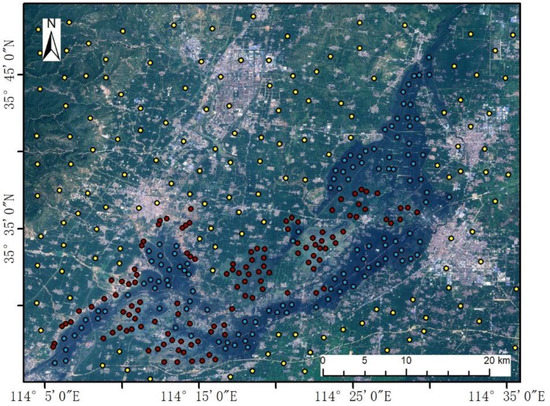 Sample points for partial extraction threshold. The yellow sample points are unaffected areas, the blue sample points are flood inundation area and, and the red sample points are flood-affected area.