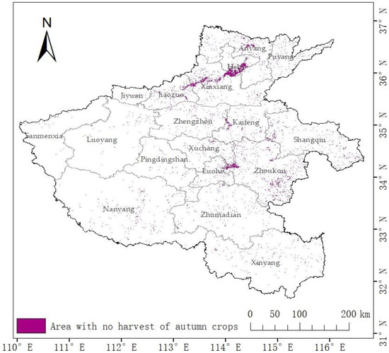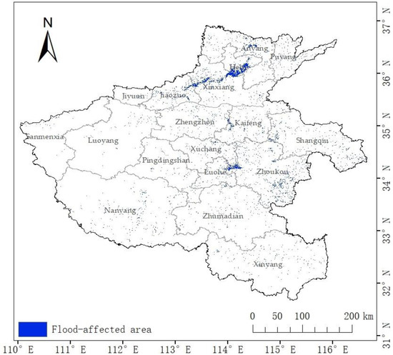 The method developed in this study was used to extract the flooding extent maps over the agricultural land in the study area (Figure 8 and Figure 9). Quantitatively, the flood inundation area of the crops throughout Henan Province was 1563.66 km2, and the flood-affected area of the crops in the entirety of Henan Province was 5441.73 km2.
