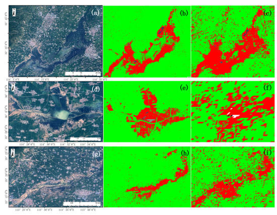 Results of Sentinel-2 true color synthetic images (a,d,g), flood inundation area (b,e,h), and flood-affected area (c,f,i).