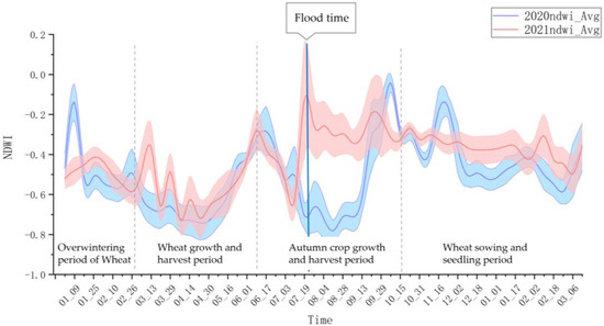 Similar to the Sentinel-1 images, cloud masking, stitching, and cropping were also performed on the MODIS images at different image time window in order to obtain an image with full coverage. For the NDVI images, Two MODIS product images for 12 July 2021 (before the flood), and 28 July 2021 (after the flood), were used as the database for extracting the NDVI values. For the NDWI images, five images from 12 July 2021 (before the flood), and from 20 July to 30 August 2021 (after the flood), were selected as the database for extracting the NDWI indexes, and the mean values of the three images taken after the flood were calculated to obtain the final NDWI index data (Figure 5). The detailed effect of the time window size to the extraction result is discussed in Section 4.1.