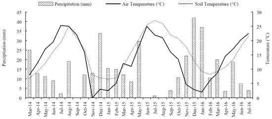 Average monthly air and soil temperatures (20 cm depth) and amount of precipitation during the two growing seasons (2014 for spring wheat and 2015−2016 for winter wheat).
