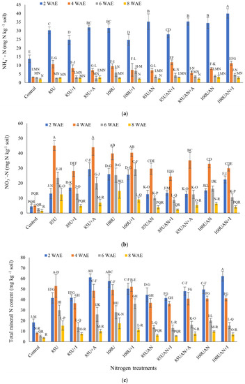 Figure 2a–c show the NH4+-N, NO3−-N, and TMN content in soil (0–30 cm depth). In all treatments, NH4+-N content was highest at 2 WAE; the highest value was shown in the treatment of 100UAN + I, while the lowest value was observed in the control, followed by 100U + I and 85U + I. In general, a sharp reduction was found from the 2nd WAE to the 4th WAE, and afterward, the reduction tended to be smoother (Figure 2a). At 8 WAE, no difference was found among the treatments.