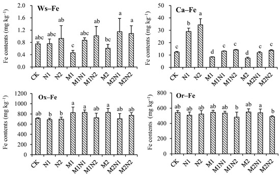 The Ws–Fe and Ca–Fe contents increased with increasing nitrogen fertilizer use with or without organic–fertilizer application in the soil, while the Ox–Fe and Or–Fe contents slightly declined in response to the nitrogen–fertilizer treatments. It was obvious that the nitrogen fertilizer had a more dramatic positive effect on the Ca–Fe. The use of the organic fertilizer caused a slight decline in the Ws–Fe, and a significant decline in the Ca–Fe in the soil. The Ca–Fe contents in response to the M1 and M2 treatments decreased approximately 10% compared to that under the CK treatment, while the Ca–Fe contents under the M1N1 and M2N2 treatments decreased by approximately 50% compared to that under the N1 and N2 treatments. The use of organic fertilizer can induce slight increases in Ox–Fe and Or–Fe (Figure 1).