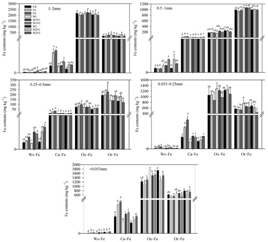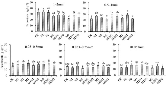 The Fe contents in the macro–aggregates (1–2 mm and 0.5–1 mm) were higher than those in the ranges of 0.25–0.5 mm, 0.053–0.25 mm, and <0.053 mm (Figure 2). In the 1–2–millimeter soil aggregate, the treatments with organic fertilizer had significantly low Fe contents compared to the CK and individual nitrogen–fertilizer treatments. The use of a nitrogen–fertilizer supplement in the soil slightly alleviated the Fe decrease caused by the organic fertilizer (Figure 2). However, in the other soil aggregates, the organic fertilizer had no noticeable effect on the Fe contents, and the nitrogen fertilizer slightly increased the Fe contents in most cases (Figure 2).
