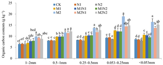 Contents of organic carbon in soil aggregates after 38–year fertilization with nine treatments. CK: no fertilizer, N1: low nitrogen, N2: high nitrogen, M1: low manure, M1N1: low manure and low nitrogen, M1N2: low manure and high nitrogen, M2: high manure, M2N1: high manure and low nitrogen, M2N2: high manure and high nitrogen. Different lower–case letters denote significant differences between treatments by least–significant difference at the 5% level.