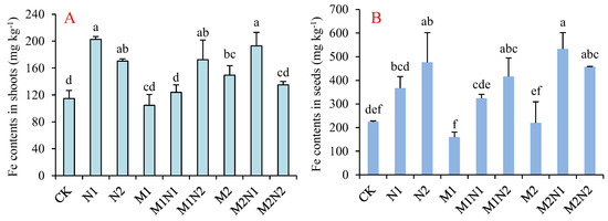 The Fe contents in the soybean shoots were highest in response to the N1 and M2N1 treatments, followed by the N2 and M1N2 treatments. The Fe contents in the shoots were relatively low in response to the CK, M1, M1N1, and M2N2 treatments (Figure 5A). The Fe contents in the soybean seeds significantly increased in response to the nitrogen–fertilizer treatments and the higher the amount of nitrogen fertilizer, the higher the Fe content in the soybean seeds, regardless of the organic–fertilizer application. The organic–fertilizer treatments had no significant influence on the Fe contents in the soybean seeds (Figure 5B).