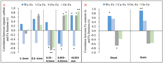 Correlations between indices. (A): Organic carbon and Fe fractions in soil aggregates. (B): Fe contents in plants and Fe fractions in soil. Ws–Fe: water–soluble Fe, Ca–Fe: carbonate bound Fe, Ox–Fe: iron–manganese–oxide–bound Fe, Or–Fe: organic–matter–bound Fe. * and ** denote statistically significant differences at p < 0.05 and p < 0.01, respectively, n = 9.