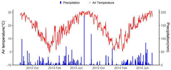 Daily air temperature and precipitation from 2012 to 2014 at the Qingyanzhou Ecological Research Station, south China.