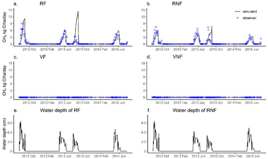 Observed and simulated (a–d) daily CH4 emission and (e,f) water depth from 2012 to 2014 under the different cropping systems and fertilization levels. RF: rice with fertilization; RNF: rice without fertilization; VF: vegetable with fertilization and VNF: vegetable without fertilization.