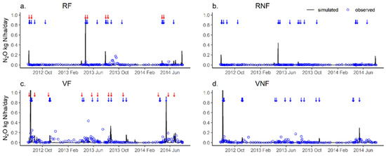 Observed and simulated (a–d) daily N2O emission under the different cropping systems and fertilizations from 2012 to 2014. RF: rice with fertilization; RNF: rice without fertilization; VF: vegetable with fertilization and VNF: vegetable without fertilization; red arrows indicated fertilizer application events; and blue arrows indicated irrigation events.