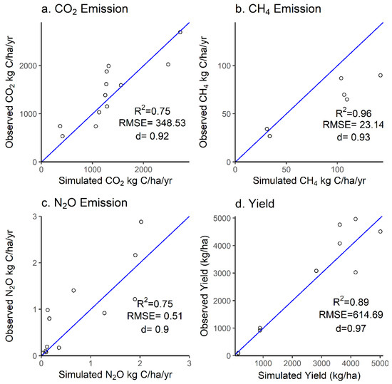 The DNDC-simulated results were compared against the field-observed results under different cropping systems and fertilizer application rates. The comparisons between the observations and simulations were determined by the coefficient of determination (R2), d-index (d) [40] and root mean square error (RMSE). The Wilcoxon test was used to analyze the differences in the GHGs emissions among the treatments at the p < 0.05 level.
