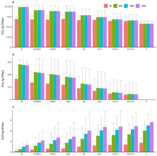 Average annual (a) CO2, (b) CH4 and (c) N2O emissions crop yield from the 40-year simulations as influenced by cropping systems and fertilizations. R and V represent a rice year or vegetable year, respectively; 0, 50, 100 and 150 F represent 0, 50, 100 and 150% of the conventional fertilization level in the experiment.