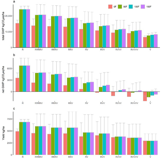 Average annual (a) total global warming potentials (GWPs), (b) net GWPs and (c) annual crop yields across the 40-year simulations as influenced by cropping systems and fertilizations. R and V represent a rice year or vegetable year, respectively; 0, 50, 100 and 150 F represent 0, 50, 100 and 150% of the conventional fertilization level in the experiment.