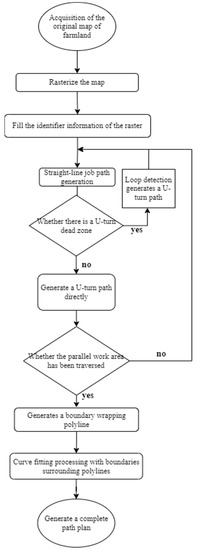 The path planning algorithm in this study is mainly composed of a parallel operation path and boundary surrounding the operation path, and the parallel operation path is to use cyclic detection and pre-collision detection to ensure that the entire map has been traversed. The boundary wrapping path requires supplemental work on the edges of the parallel work area, and the boundary wrapping path is connected by continuous curves or polylines to form a complete wrapping path line. After the operation width is determined, this paper will simulate different strategies and use the polyline algorithm and curve fitting algorithm to solve them, which can be referred to [28,29,30,31,32].