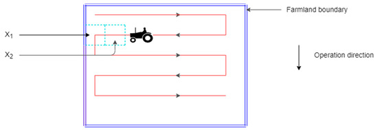Because in the parallel operation path the main way is to turn in situ, the determinants of the turning radius are therefore the working width of the robot,= and the minimum turning radius . The calculation is shown in Equation (5):