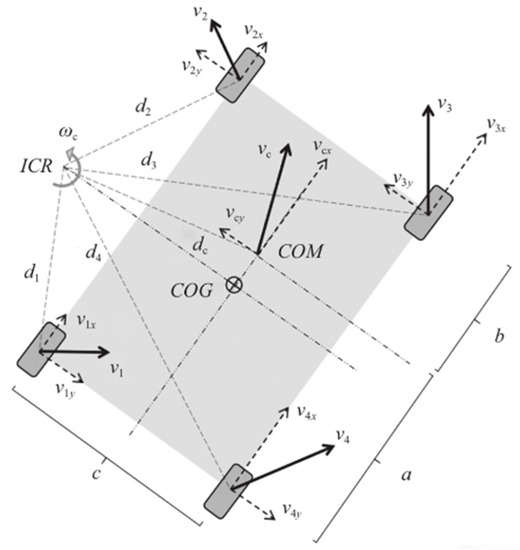 Four-wheel differential model. ICR is the rotate center; COG is the geometric center; is the distance from the four wheels to the ICR; COM defines the centroid; is the distance from COM to the ICR; c is the wheelbase of the left wheel to the right wheel; a is the distance from COM to the backend; and b is the distance from COM to the front end.