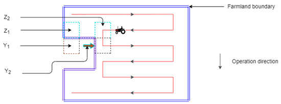 The selection of the operation direction should consider the direction with the highest operation coverage. Generally, the operation direction is obtained by the maximum span. The generation of parallel operation paths is based on the selected operation direction. If the map boundary is directly in front of the path direction (i.e., the occupation identifier of the identified grid is 1), the operation path is immediately set and the turning action is started. If the front grid is free (i.e., the occupation identifier of the grid is identified as 0), the job path is generated forward. After completing the turning action, we continue to generate the parallel operation path of the next line and repeat the cycle until the parallel operation area of the map is traversed and the generation of the entire parallel operation path is completed. The schematic diagram of parallel operation path generation is shown in Figure 4.