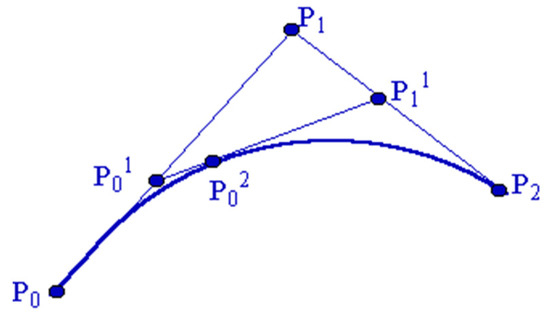 The fitting principle of the Bézier curve is shown in Figure 7. Suppose P_0, , and P_2 in the figure are three points in a different order on a parabola. The two tangents crossing P_0 and P_2 intersect at P_1, and the tangents crossing P_0 P_1 and P_2 P_1 at intersect at and , then the following proportion Equation (7) holds: