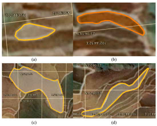 Screenshot of the actual field selected in Google Earth software. (a) Field 1 is small, multilateral, and irregular with an area of 67.94 ; (b) field 2 is small and irregular, with an area of 87.23 ; (c) field 3 is large-scale, multilateral and irregular with an area of 1572.97 ; (d) field 4 is large and irregular with an area of 615.35 .
