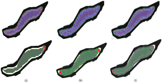 Screenshot of the calculation example results for irregular fields. (a) B-ield 1 path planning simulation and replay evaluation of the EHNS algorithm; (b) B-field 1 path planning simulation and replay evaluation of the BP algorithm; (c) B-field 1 path planning simulation and replay evaluation of the IFC algorithm; (d) B-field 2 path planning simulation and replay evaluation of the EHNS algorithm; (e) B-field 2 path planning simulation and replay evaluation of the BP algorithm; (f) B-field 2 path planning simulation and replay evaluation of the IFC algorithm; (g) A-field 3 path planning simulation and replay evaluation of the EHNS algorithm; (h) A-field 3 path planning simulation and replay evaluation of the BP algorithm; (i) A-field 3 path planning simulation and replay evaluation of the IFC algorithm; (j) A-field 4 path planning simulation and replay evaluation of the EHNS algorithm; (k) A-field 4 path planning simulation and replay evaluation of the BP algorithm; (l) A-field 4 path planning simulation and replay evaluation of the IFC algorithm.