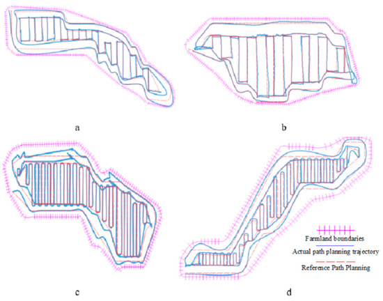 Verification of the path trace results for the experiment. (a) represents the path tracking result of field block 1; (b) represents the path tracking result of field block 2; (c) represents the path tracking result of field block 3; and (d) represents the path trace result of field block 4.