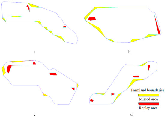 In the replay and missed evaluation in Figure 13, the solid blue line represents the farmland boundary, the yellow area represents the missed area, and the red area represents the replay area.