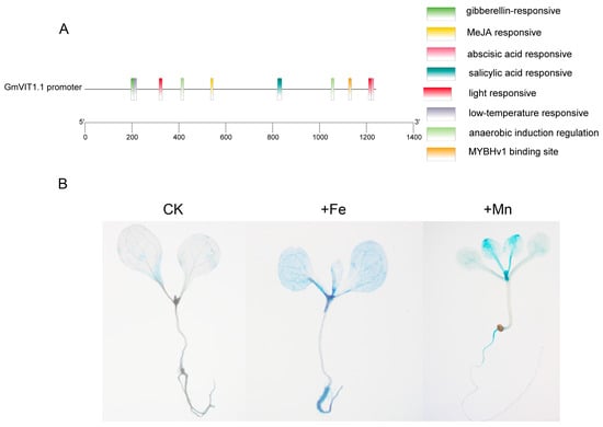 Cis−elements in the GmVIT1 promoter and histochemical staining of transgenic Arabidopsis harboring the GmVIT1pro::GUS constructs. (A) Predicted positions and functions of cis-elements in the GmVIT1 promoter. (B) GUS staining results of GmVIT1pro::GUS transgenic Arabidopsis under 0.1 mM Fe-EDTA+0.1 mM MnCl2 (CK), 0.3 mM Fe-EDTA + 0.1 mM MnCl2 (+Fe), and 0.3 mM MnCl2 + 0.1 mM Fe-EDTA (+Mn) for 7 days. The seedlings were then stained for detection of β-glucuronidase activity.