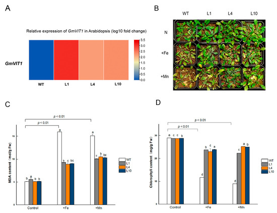 We generated GmVIT1 transgenic Arabidopsis lines and raised T3 lines in this study. The transgenic lines, L1, L4, and L10, which have high expression levels of GmVIT1, were exposed to +Fe and +Mn stress (Figure 8A). GmVIT1 transgenic Arabidopsis lines showed better growth status than wild-type plants. Under +Fe and +Mn stress, both transgenic Arabidopsis and wild-type Arabidopsis showed visible leaf chlorosis compared to non-stress conditions (Figure 8B). The MDA content of transgenic lines and WT increased dramatically under +Fe or +Mn stress (p < 0.01), indicating that +Fe or +Mn resulted in membrane damage of cells in plants. However, MDA content in L1, L4, and L10 were significantly lower than that in the wild-type plants under +Fe or +Mn stress (p < 0.05) (Figure 8C). The MDA results showed that overexpression of GmVIT1 partially rescued damage to the membrane in plant cells. The chlorophyll content in GmVIT1 transgenic Arabidopsis was significantly lower than that in the wild-type plants under normal conditions (p < 0.05). When exposed to +Fe or +Mn stress, chlorophyll content was significantly reduced in transgenic and wild-type Arabidopsis (p < 0.01). The chlorophyll content of L1, L4, and L10 were significantly higher than that in the wild-type plants (p < 0.05) (Figure 8D).