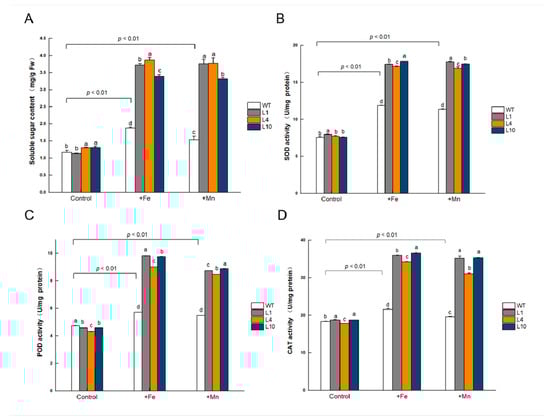 The physiological index of GmVIT1 transgenic lines and wild-type plants grown under excess iron or manganese. (A) Soluble sugar content. (B) Superoxide dismutase activity. (C) Peroxidase activity. (D) Catalase activity. The plants were grown in 1/2 Hoagland nutrient solution for 14 days and treatedwith 0.1 mM Fe-EDTA + 0.1 mM MnCl2 (CK), 0.3 mM Fe-EDTA + 0.1 mM MnCl2 (+Fe), and 0.3 mM MnCl2 + 0.1 mM Fe-EDTA (+Mn) for 7 days. Experiments were repeated three times, and each group contained five samples. All the data represent the means of three replicates. Lowercase letters represent a statistically significant difference in GmVIT1 transgenic lines and wild-type plants under the same condition, p < 0.05.