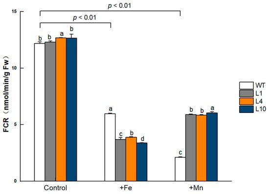 Grown under the normal condition, the FCR activity in GmVIT1 transgenic Arabidopsis roots was significantly higher than that in wild-type plants (p < 0.05). When exposed to excess Fe or Mn, the FCR activity significantly decreased (p < 0.01). The FCR activity in GmVIT1 transgenic Arabidopsis was significantly lower than that in the wild-type plants under +Fe stress (p < 0.05), while significantly higher than that in the wild-type plants under +Mn stress (p < 0.05) (Figure 10). Although the FCR activity in GmVIT1 transgenic plants showed a downward trend, it reflected an opposite response to +Mn and +Fe stress.