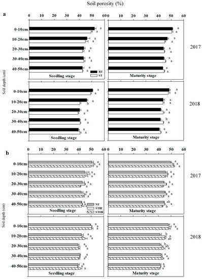 Effects of different tillage practices on soil porosity in maize season. (a) wheat season tillage; (b) maize season tillage. RT: rotary tillage; ST: subsoiling; STIR: inter–row subsoiling tillage; STOR: on–row subsoiling tillage. Different letters indicate statistically significant differences at the p < 0.05 level (ANOVA and Duncan’s multiple range test; n = 3), the same letters are not significantly different between two treatments.