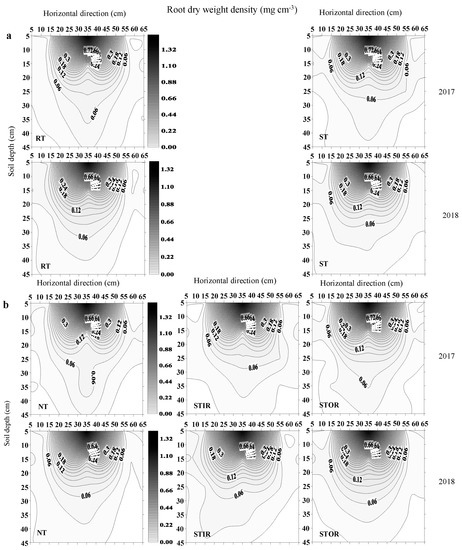 Effects of different tillage practices on root dry weight density in maize at the flowering stage. (a) wheat season tillage; (b) maize season tillage. RT: rotary tillage; ST: subsoiling tillage; STIR: inter–row subsoiling tillage; STOR: on–row subsoiling tillage.