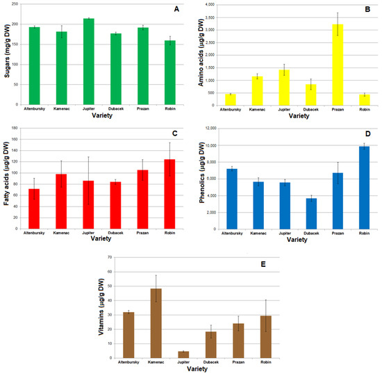 The total content of (A) free sugars, (B) free amino acids, (C) fatty acids, (D) free phenolics, and (E) vitamins in six lettuce varieties grown under control conditions.
