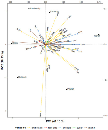 Further, the results of the principal component analysis (PCA) of 53 analytes detected in the six lettuce varieties, including 3 sugars, 21 amino acids, 9 fatty acids, 11 phenolics, and 9 vitamins, were presented as a PCA biplot (Figure 2). Here, 69.48% of the data variability is explained by the first two principal components (41.15% by PC1 and 28.33% by PC2). According to PCA, hydroxyproline (HPR) shows the highest variability across the varieties, i.e., the highest values in varieties Prazan and Dubacek, and the lowest in Altenbursky and Kamenac. Variety Robin has rather lower values of amino acids and conversely higher values of fatty acids, and it differs the most from var. Jupiter. Moreover, the results of this analysis reveal that varieties Altenbursky and Kamenac are chemically the most similar varieties, proving the fact that comprehensive chemical analysis is an important part of the description of plant genotypes. In conclusion, amino acids, but also selected phenolic compounds, are presented as the main markers for the chemical characterization of the investigated lettuce varieties. This fact was also confirmed in our previous study on selected genotypes of medicinal and aromatic plants [36], where amino acids and phenolics, together with terpenes, were confirmed as chemotaxonomic markers.