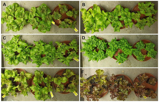 Lettuce varieties immediately before harvest. From left to right: control, salt stress, drought stress. (A) Altenbursky, (B) Kamenac, (C) Jupiter, (D) Dubacek, (E) Prazan, (F) Robin.
