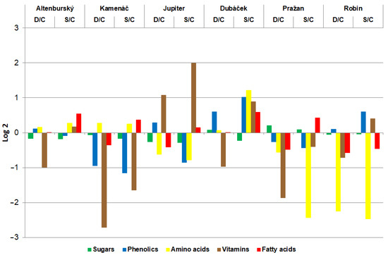 To study the impact of preharvest abiotic stress on selected lettuce varieties, we used advanced statistical analysis, where, in total, 53 variables (analytes) were studied in six varieties grown under control and two stress conditions. Barplots visualizing the log ratios of levels of each class of investigated compounds are summarized in Figure 4. The greatest changes were in the levels of vitamins, following the amino acid and phenolic compounds.