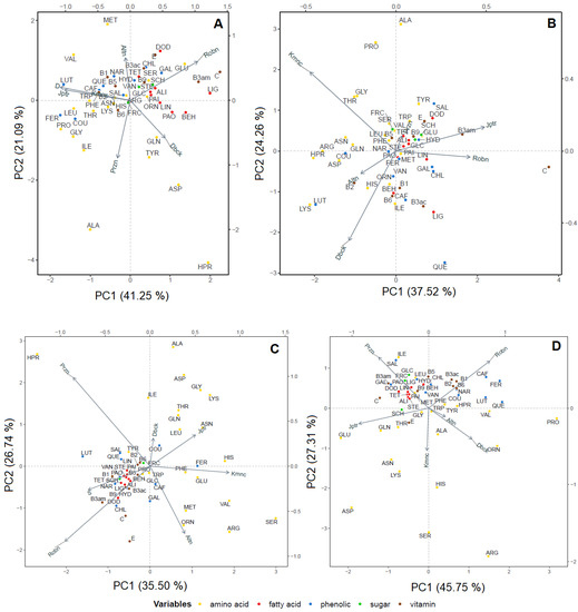 The content and composition of free sugars, fatty acids, free amino acids, free phenolics, and vitamins in the six lettuce varieties investigated in this study are summarized in Tables S1–S5 (Supplementary Materials). Although these species have different morphological characteristics (Table 2), they are also distinct in chemical composition, which is closely related to their genetic background [5,7,18].