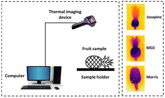 Imaging-based techniques have been developed as one of the non-destructive means to substitute the conventional methods that depend on pattern matching by comparing the input image with reference data to compute the correlation []. Thermal imaging has been applied in various food and agricultural applications, including fruit detection by means of differentiating the fruit based on the temperature or thermal properties []. Furthermore, thermal imaging can generate the simultaneous monitoring of the dynamic differentiation of temperature by providing a high correlation with the internal quality attributes of the fruit []. Döner et al. [] investigated the effect of ohmic thawing on the temperature distribution of minced beef using thermal imaging. Badia-Melis et al. [] explored the potential of thermal imaging in predicting the surface temperature of apples in two different packaging boxes with an error of 0.41 °C (plastic boxes) and 0.086 °C (cardboard boxes), respectively. Wang et al. [] evaluated the potential of a thermal imaging system to investigate the temperature distribution of stem lettuce slices during microwave freeze drying and pulse-spouted microwave freeze drying. In addition, Xu et al. [] evaluated the temperature distribution of rapeseed using thermal imaging during dielectric drying. Manickavasagan et al. [] utilised the thermal imaging technique to classify eight different wheats that obtained classification accuracies of 95% using the quadratic discriminant method. Jiang et al. [] reported the temperature distribution of banana chips using thermal imaging during microwave drying. The findings demonstrated that the temperature distribution of the samples was uniform during the sublimation drying phase. Ma et al. [] investigated the reaction of plasma-activated water on the decay and quality of Chinese bayberries using the thermal imaging technique. Mohd Ali et al. [] reported the application of thermal imaging in predicting pineapple quality, which achieved a coefficient of determination (R2) of 0.94 using a partial least squares model. This study continued further using different machine learning classifiers in order to discriminate the pineapple varieties that obtained the highest classification accuracy of 100% using support vector machines [].