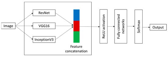 After image pre-processing and analysis, the thermal images were integrated for multimodal data fusion. The data fusion based on the selected image parameters was fed into the deep learning network architecture for the classification of the pineapple varieties. Deep learning network architecture signifies a significant role in establishing a multimodal data fusion framework. The advantage of multimodal data fusion is associated with its capability in representation learning, as it could transform raw multimodal input into higher input data. In this sense, the network architectures do not require complicated pre-processing procedures in order to extract the specific features from each model network. Multimodal data fusion is designed by concatenating the extracted features from three CNNs of ResNet, VGG16, and InceptionV3, which were connected to a convolutional layer for the classification task. These state-of-the-art CNN architectures used convolution and pooling operations in several layers with different widths, depths, and cardinality []. The convolutional layer assists the network to learn from the concatenated features extracted from those three CNN architectures []. In this way, the CNN models could learn the integrated features that are beneficial in the classification tasks. Additionally, it could also be implied that representation learning is significantly faster than a network trained by a single model []. Compared with a single model, the accuracy of multimodal data fusion is improved by enhancing the interpretability of the model recognition results. Figure 2 shows the multimodal data fusion of the deep learning framework for the determination of pineapple varieties.