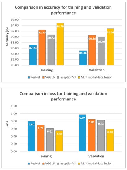 The comparison in accuracy and loss for the training and validation performance of deep learning models is demonstrated in Figure 3. The trend observed in the training and validation results is shown in the estimation of each deep learning model on the testing dataset. For the training dataset, the multimodal data fusion outperformed the other deep learning models with an accuracy of 94.76% and loss of 0.55, respectively. ResNet, InceptionV3, and VGG16 also achieved promising results, with an accuracy and loss of 87.23–92.45% and 0.61–0.80, respectively. Likewise, a similar trend was also demonstrated in the validation dataset. The multimodal data fusion obtained the highest accuracy of 92.84%, followed by VGG16 (90.58%), InceptionV3 (92.84%), and ResNet (85.06%). In this case, the accuracy obtained from the multimodal data fusion according to feature concatenation distinctly denoted the highest performance compared to the single deep learning models. The multimodal data fusion was more stable compared to the single CNN models. During the learning process, the irrelevant portion of a task was prone to noise, which can enhance the generalisation ability of the models. In this case, multimodal data fusion can improve the model performance to a certain degree that has proven to be superior to the single CNN models. By optimising the shared portion of an epoch twice during fine-tuning, the training loss of the models declined rapidly and became more stable. By comparing different deep learning models with the same hyperparameters, it could determine the superiority of the models under specific configurations. To better understand how the deep learning models are generalised for other issues and domains may be helpful in understanding features training or fine-tuning.
