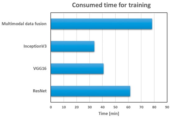 The comparison of the deep learning models in terms of the consumed time for training is displayed in Figure 4. The multimodal data fusion obtained the longest consumed time (78.3 min) for the training, considering the fact that the model comprised feature concatenation of three different CNN architectures. InceptionV3 took the shortest training time with 33.7 min, followed by VGG16 (40.9 min) and ResNet (61.4 min), respectively. Multimodal data fusion has a huge number of parameters, which causes a long training time, slow convergence speed, and vast storage capacity in practical applications. The weights of the convolution layers are pre-trained by multimodal data fusion in order to avoid a long training time. In this case, dropout is applied to reduce the training time and control overfitting due to a large number of parameters. It should be emphasised that the model training time of the deep learning models relied on hardware resources that could be shortened by using an advanced graphics processing unit (GPU).