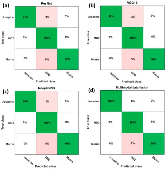 Different deep learning network architectures may vary in terms of feature recognition. By fusing these multimodal networks, a high classification accuracy could be achieved compared to a single network. The multimodal data fusion, along with the three CNN architectures, including ResNet, VGG16, and InceptionV3, was developed for fruit quality detection as the basis for the deep learning approach. The methods for the network architectures are evaluated under the same parameter settings and configurations. Based on the findings, it is noted that the proposed multimodal data fusion method has a high accuracy compared to other single models. Figure 5 shows the confusion matrices associated with the correct classification rate (green) and misclassification rate (pink) by different deep learning models. It was observed that the classification results were consistent for MD2 with 100% accuracy for all deep learning models. For multimodal data fusion, it can be seen that MD2 and Josapine were correctly distinguished with a classification rate of 100%, respectively. InceptionV3 and VGG16 also performed well with 99% and 98% accuracies for correctly classified Josapine. On the other hand, ResNet obtained the lowest accuracy compared to the other deep learning models, with 92% accuracy for correctly classified Morris.